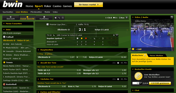 Das Livewettenangebot im Bereich Sportwetten ist super und sehr umfangreich. Man kann mehr als 30 Spotarten wetten und auf Fußball sind auf manche Matches mehr als 200 verschiedene Wetten im Angebot. Dabei kann man neben Standard Kombiwetten auch eine Menge Spezialwetten tippen wie bspw. 2-Weg Spezial, Handicap in allen Varianten, Wie viele Tore werden erzielt, Anzahl der Tore 1. und 2. Halbzeit, Anzahl der Tore Team 1 und Team 2, Doppelte Chance 1. Und 2. Halbzeit, Torwette mit vielen Optionen, Torschützen, Anzahl der Karten und vieles mehr. Mehr als 10 Mio. Kunden (!) tippen bei bet and win.
