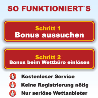 Wir listen nur Boni von wirklich guten Wettbüros und haben keine dabei, auf die man eher verzichten sollte, da sie in gewisser Weise evtl. nicht vertrauenswürdig sind oder da wir der Meinung sind, dass Kundenservice, Quotenangebot oder weitere Faktoren einfach nicht passen. Von daher hoffen wir auf viel Vergnügen mit unserem Portal und viel Spaß beim Bonus "Hunting". Den bet and win Bonus in Höhe 25 Euro kann man schon mal versuchen.